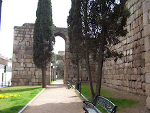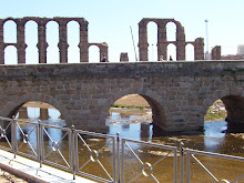 Presa de Cornalvo y acueducto de Aqua Augusta. La presa se contruyó en tiempos de Augusto con una estructura central de hormigón revestida de sillarejos escalonados de granito. Toda la construcción venía reforzada en el exterior por una gran pendiente de tierra a modo de contrafuerte -espaldón-. El dique medía unos 220 m. de longitud, 18 m. de altura y 3,50 m. de anchura superior. El acueducto que conduce el agua hasta la ciudad -16 Km.- era un tunel de manpostería con boveda de cañon, que se convertía en un canal sobre arcos para salvar las depresiones.